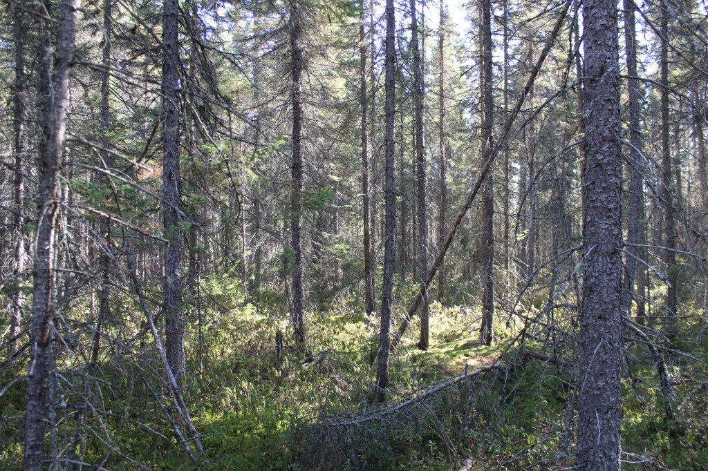 The trail weaves through two black spruce bogs, Sunday Creek Bog and another small kettle bog. Bogs in Algonquin are formed from melting glacier remains retreating from the area over 10,000 years ago, leaving bodies of water. The water is acidic due to lack of movement and circulation, leaving plant matter unable to fully decompose. A film of special plant encroaches from the edges on the surface of the water and the dead plant matter builds up over time to form a bog mat. Eventually, the bog mat is strong enough to support trees like black spruce and tamarack that can be found along this trail.
